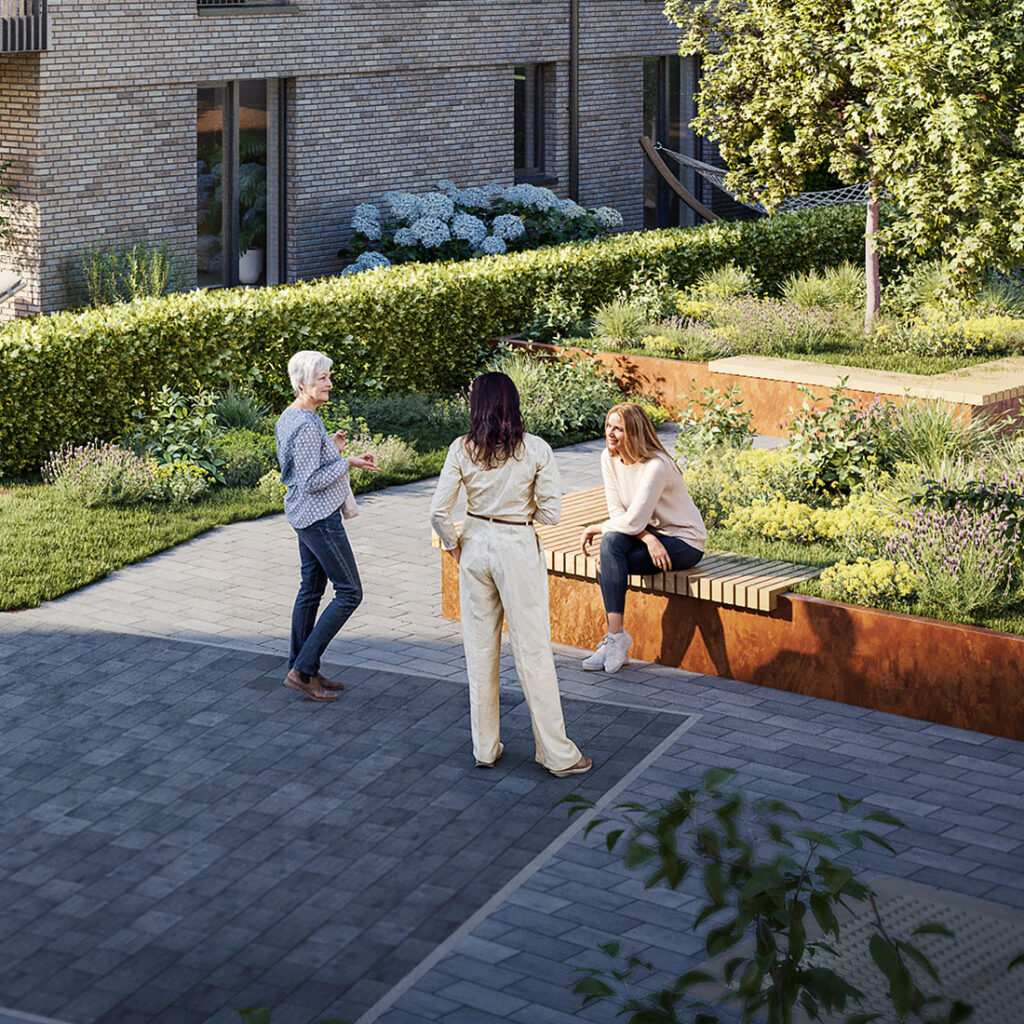 Ein Quartier mit Charakter: vier Häuser, viel Grün und durchdachte Konzepte für zeitgemäßes Wohnen.