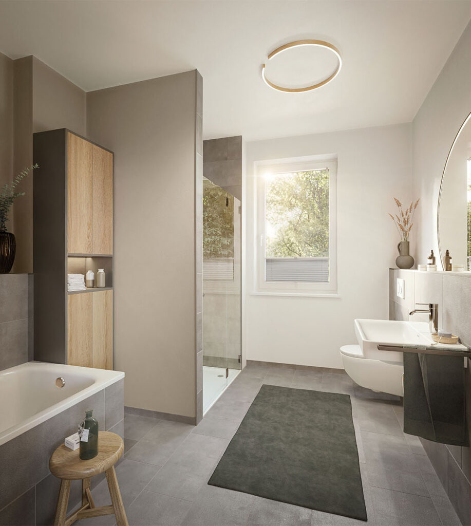 - Fußbodenheizung und zusätzliche Badheiz- körper in allen Voll- und Duschbädern